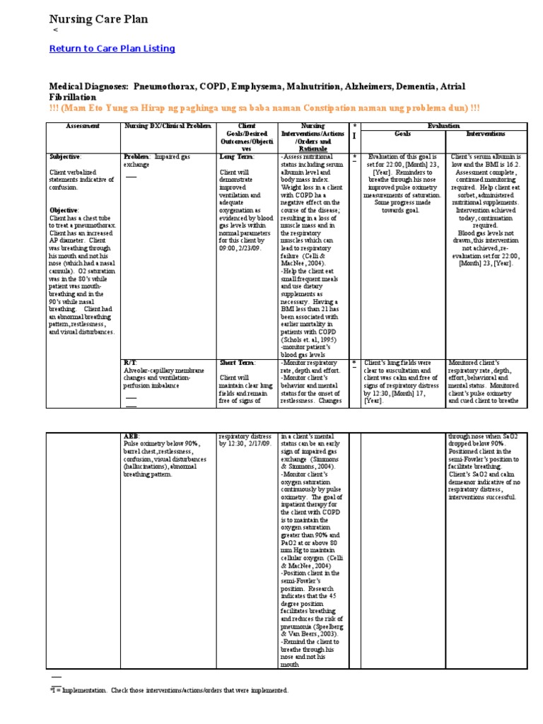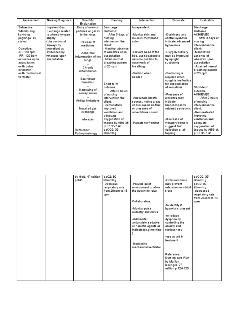 Nursing Care Plan A Client with COPD. • Ineffective airway clearance related to pneumonia and COPD • Impaired gas exchangerelated to acute and chronic lung • Impaired home maintenance related to activity intolerance EXPECTED OUTCOMES ... Get Doc